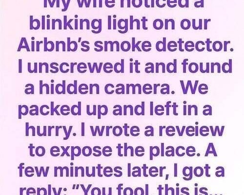 While staying at an Airbnb, a seemingly harmless blinking light on the smoke detector caught the attention of the narrator’s wife. Curious and concerned, he climbed up to inspect it — and what he found sent a wave of fear through him. Inside the device was what looked like a hidden camera lens.