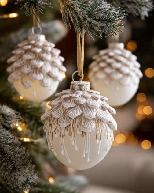 Repeat the process with the remaining ornaments until you have a complete set of frosted pinecone globes.